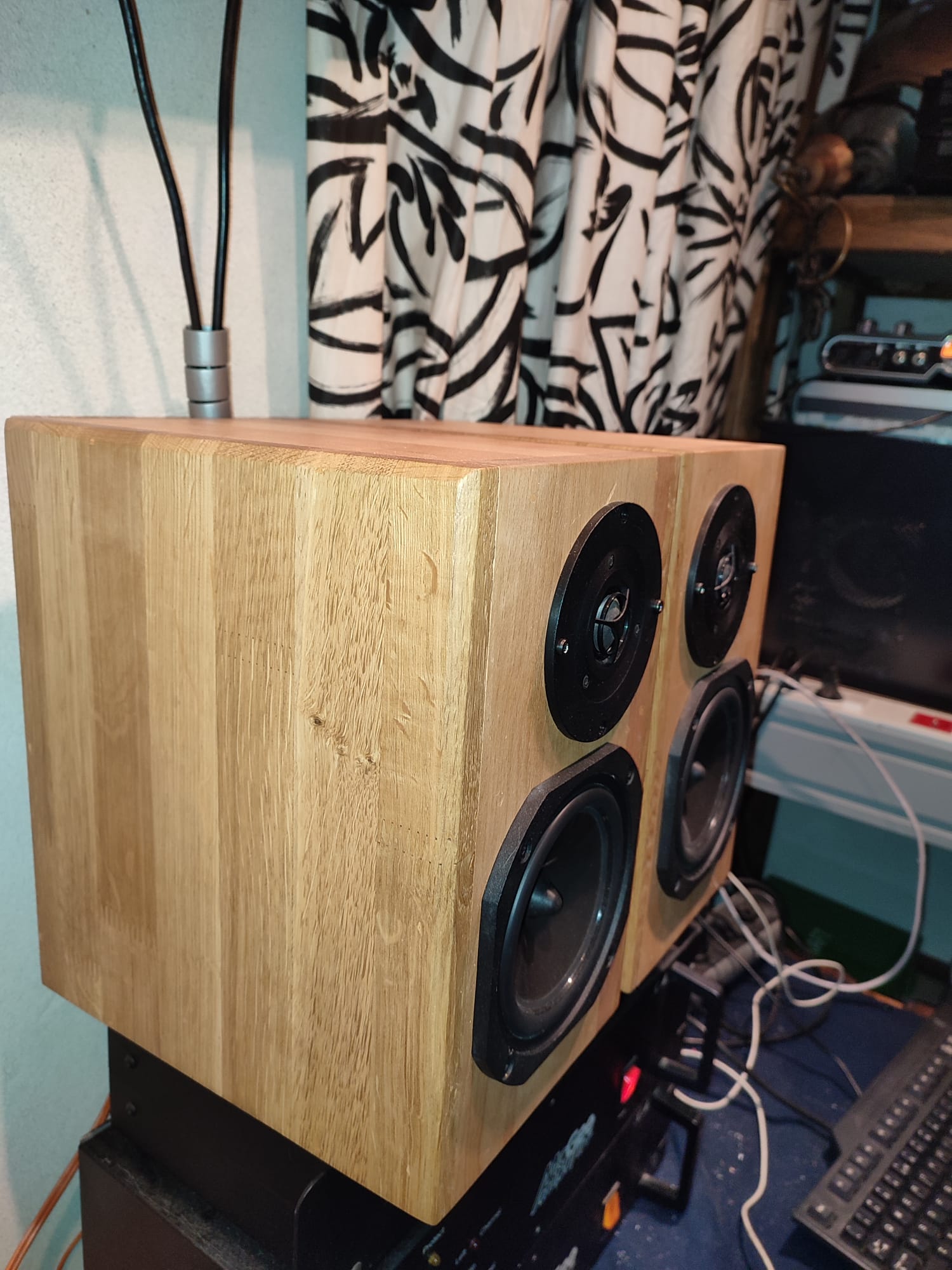 The loudspeakers are housed in custom-made oak wood boxes with rounder borders. The wood boxes are finished with a natural oil to enhance the natural beauty of the wood. The inside of the boxes is insulated with natural wool to dampen resonance and improve sound quality.